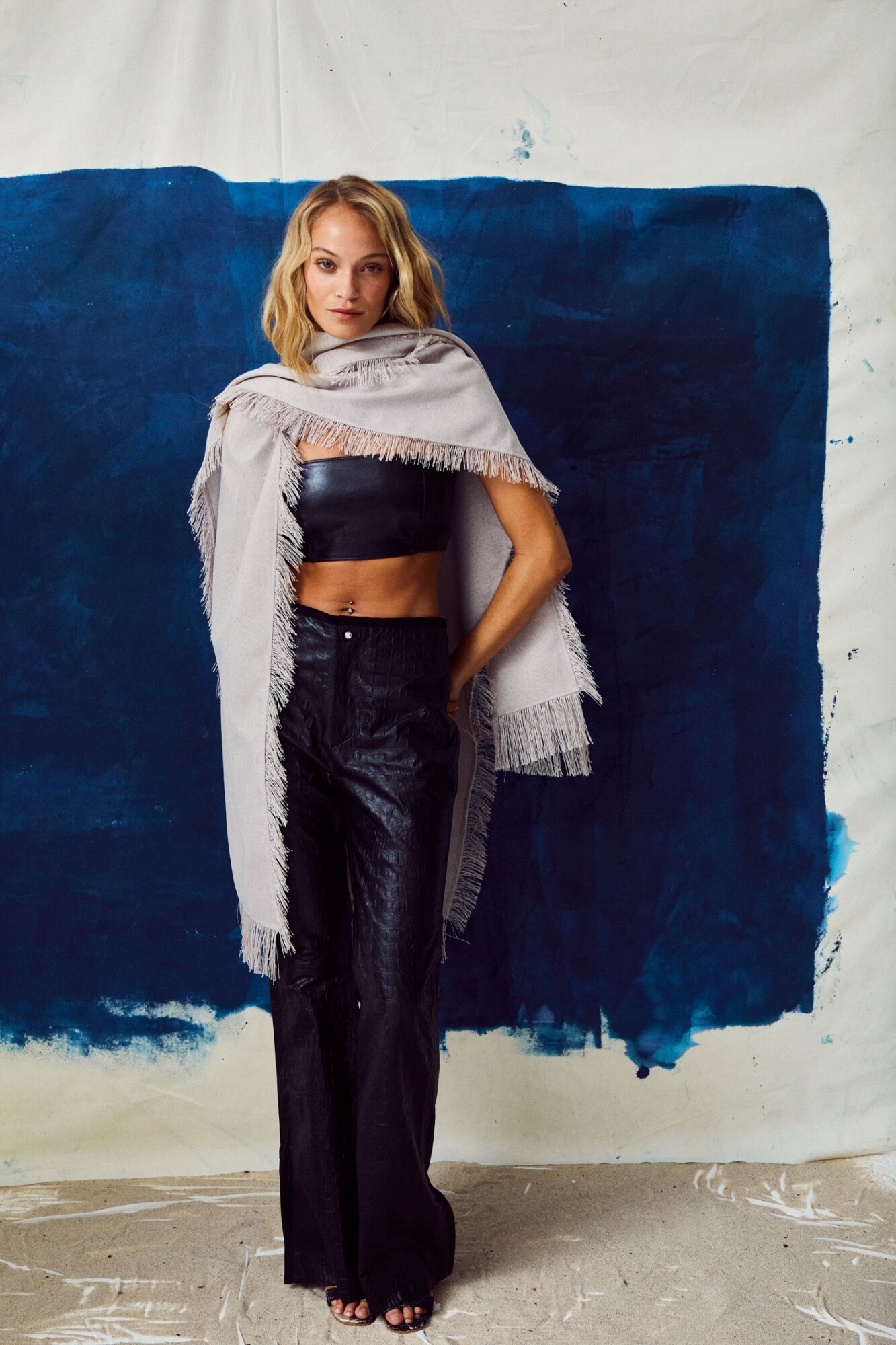 Chal de tejido liviano que contiene lino. Tiene terminaciones desflecadas. Puede usarse como capa, top o sobre falda, adaptándose a looks formales e informales.
