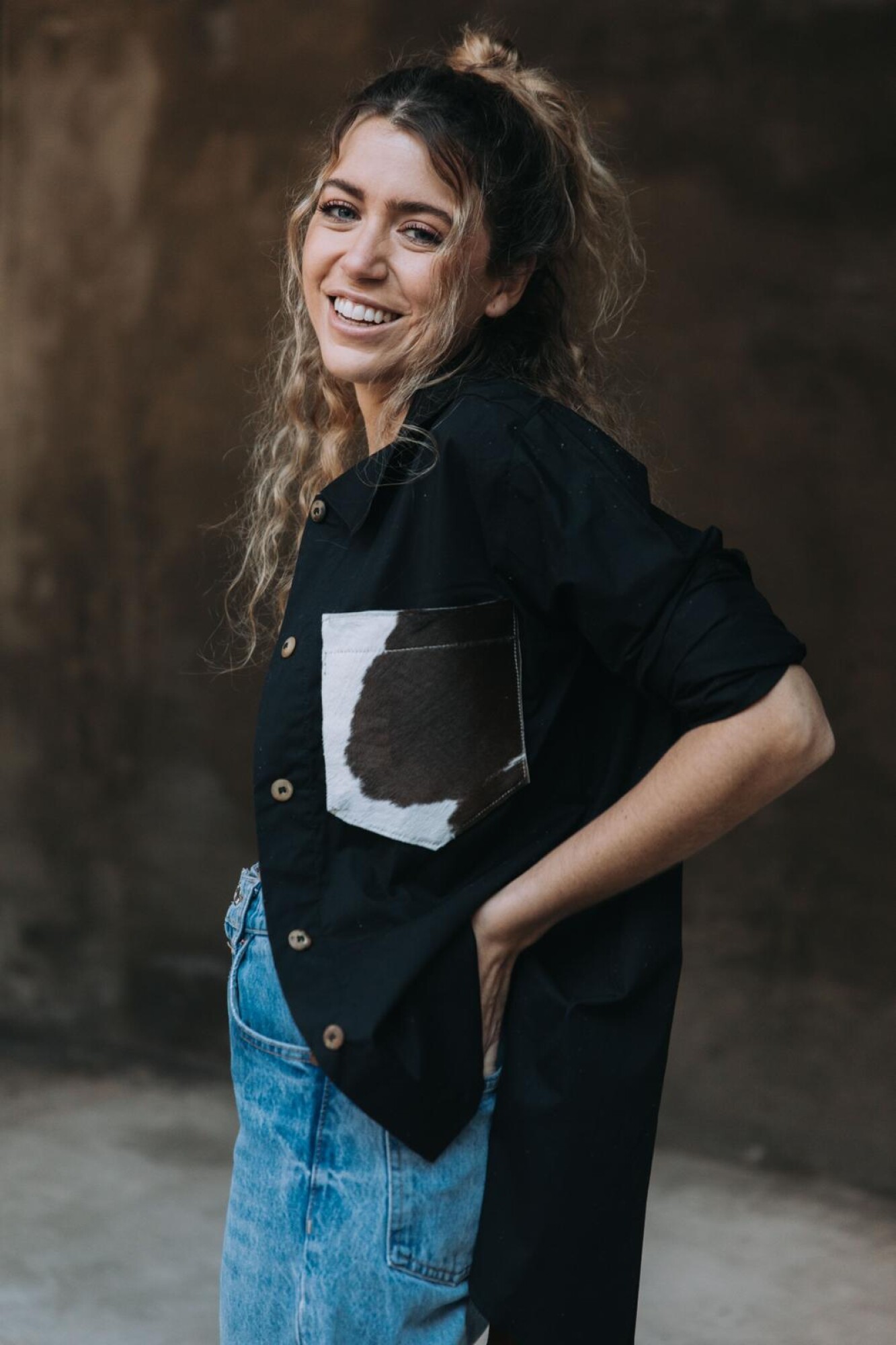 Camisa de lino con bolsillo de pelo de vaca. El bolsillo es one of a kind, ya que los cueros son todos distintos. AS080AZU https://www.agneslenoble.com/shop/pocket-shirt-azul_AS080_AZU